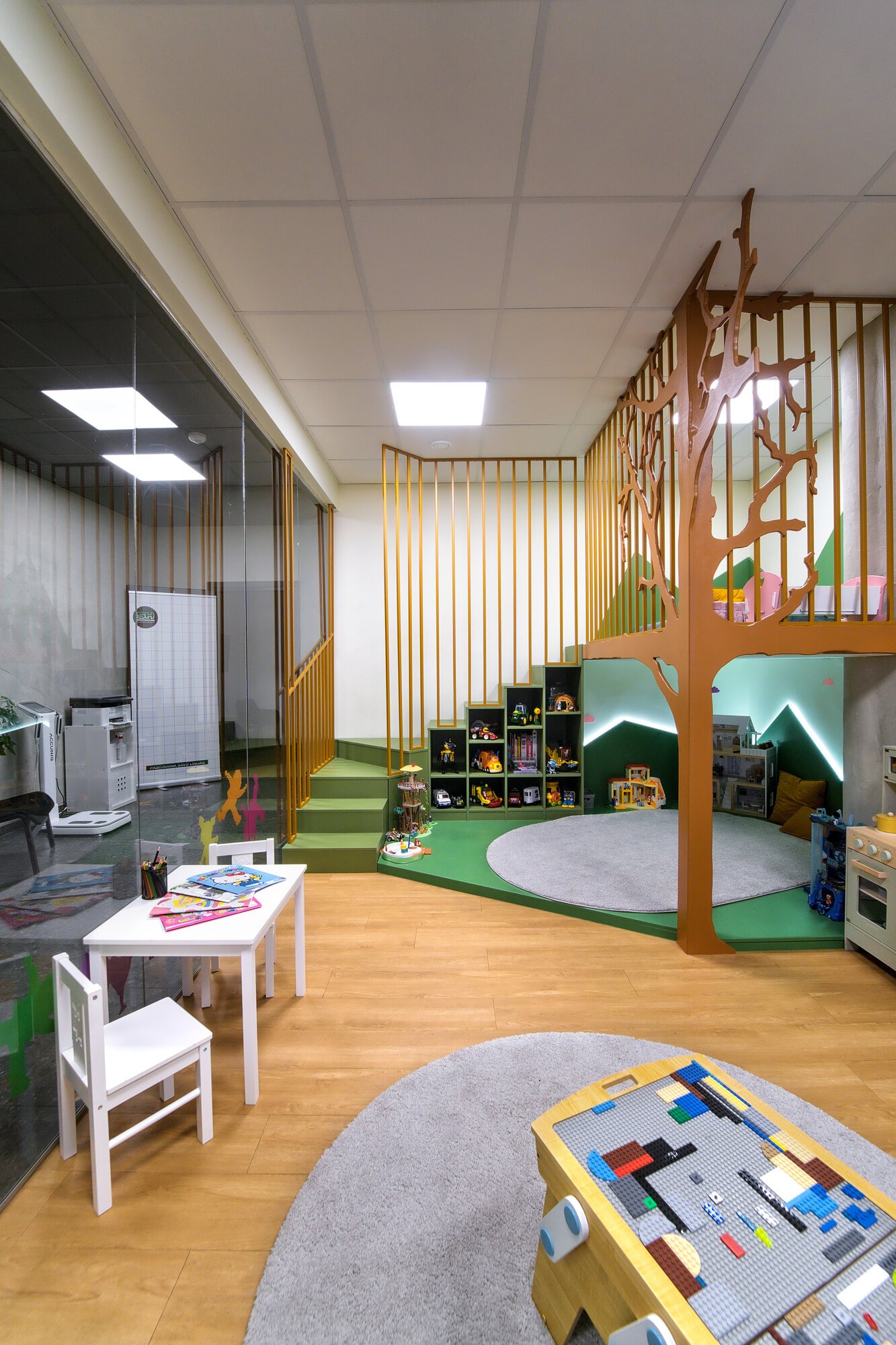 Vaikų žaidimų erdvė yra įsikūrusi šalia registratūros, vaikai puikiai yra matomi registratūros darbuotojų, tačiau už vaikų elgesį, priežiūrą kambaryje yra atsakingi jų tėvai.